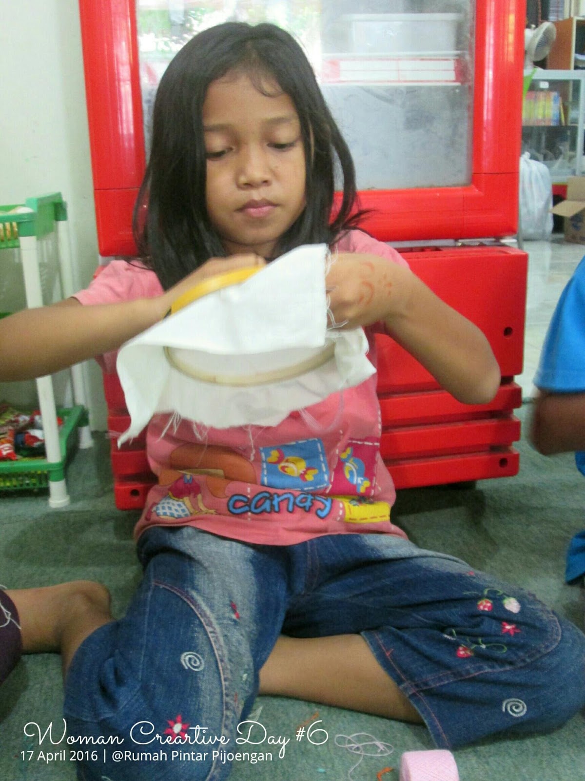 Kejutan yang lainnya adalah di WCD #6 ini teman-teman yang ikut lebih beragam yaitu sejumlah 16 orang yang terdiri dari 4 ibu rumah tangga, 7 pelajar SMP kelas 2, 4 pelajar SD kelas 3 dan 4, dan 1 pekerja. Keragaman ini cukup membuat saya senang karena saya menemukan banyak pengalaman proses belajar. Bagaimana usia tidak menjadi penghalang untuk kami saling belajar dan mengajari. Karena bagaimana pun juga, masing-masing dari mereka memiliki kreativitas dan ketrampilan yang unik. Ada yang lebih kreatif dan terampil dalam membuat pola/menggambar, ada yang lebih kreatif dan terampil dalam memadu-padankan warna benang, ada yang lebih kreatif dan terampil menyulam dengan rapih, dan lainnya.